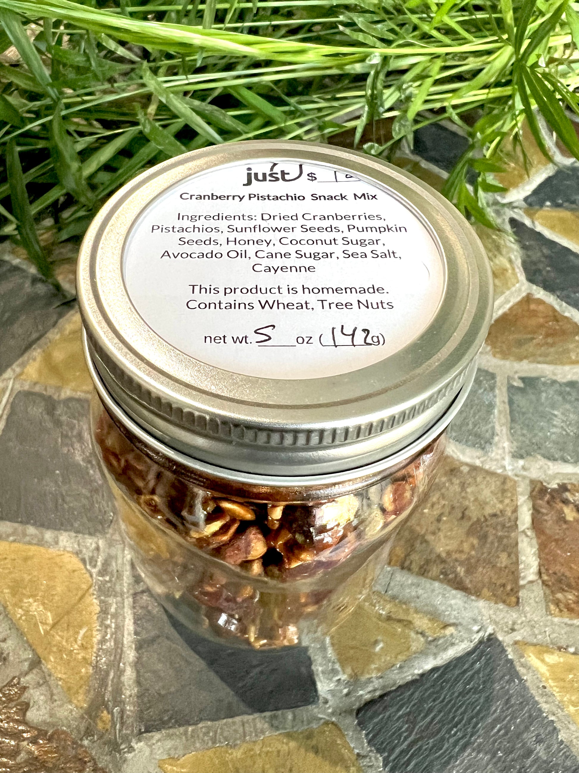 Ingredients: Pistachios, Sunflower Seeds, Pumpkin Seeds, Dried Cranberries, Honey, Coconut Sugar, Cane Sugar, Sea Salt, Cayenne