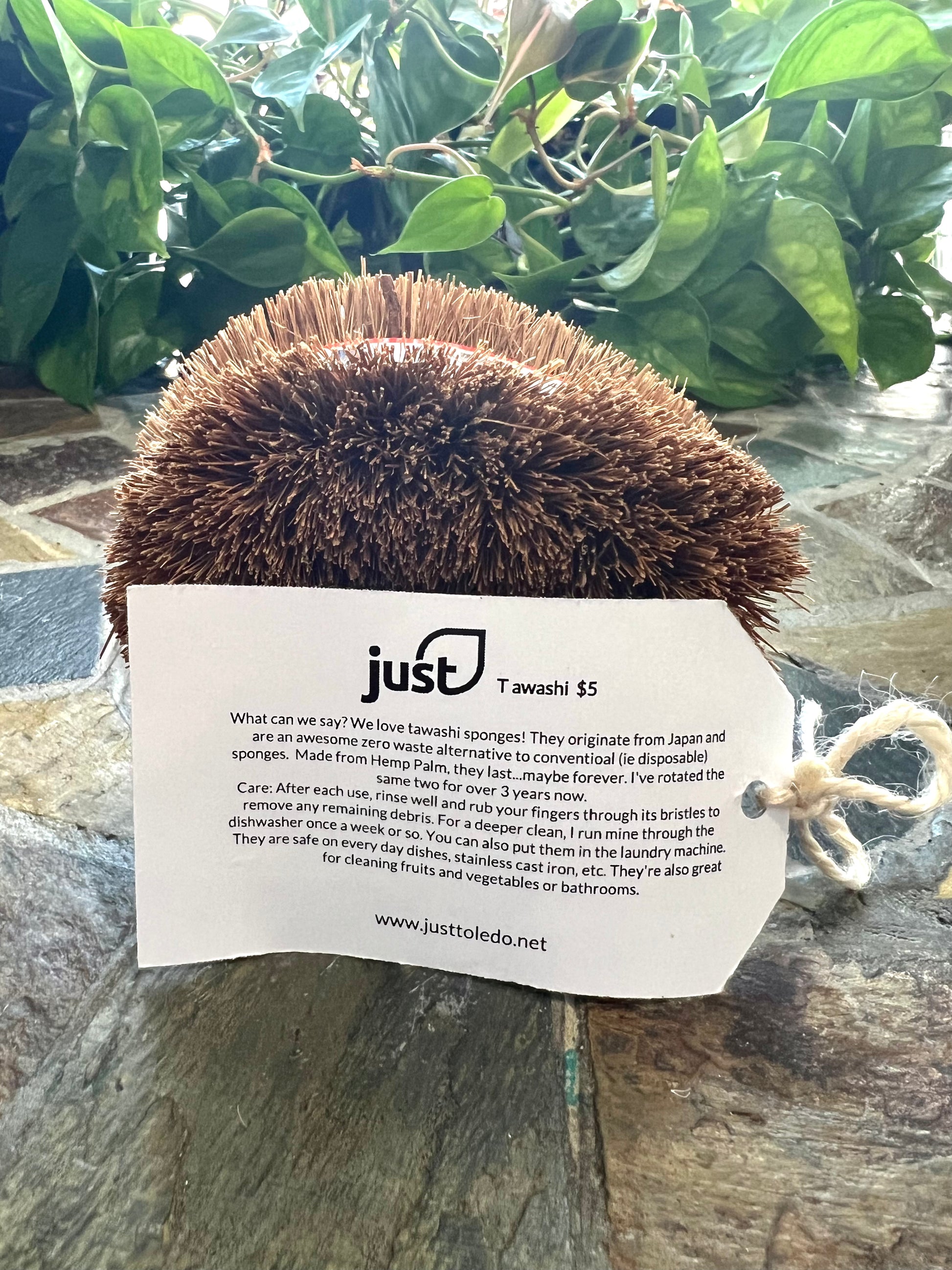 What can we say? We love tawashi sponges! They originate from Japan and are an awesome, zero waste alternative to sponges. They’re made from hemp palm and last….maybe forever. After each use, we rinse ours out and rub our fingers through its bristles, to clean out any leftover bits. For a deeper clean, you can run it through the dishwasher. I throw mine in about once a week. I’ve rotated the same two sponges for the past year and they still look brand new. They’re safe on your everyday dishes, stainless and cast iron. They even come equipped with a little hook, so you can hang them out to dry after use.